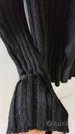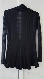 Cardigan nero aperto sul davanti e richiudibile tramite nodo, linea sfiancata da donna. Marca Zuiki. Taglia M. Materiale: purtroppo l'etichetta è bianca quindi non sono sicura ma contiene sicuramente lana (infatti mi fa allergia). Usato molto poco e tenuto con cura. Non noto difetti evidenti.