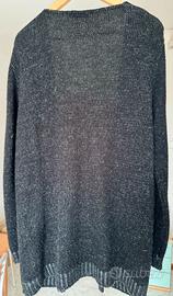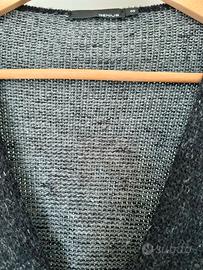 Cardigan Genius senza bottoni, aperto, lungo, tasche laterali, caldo, in maglia. Nero gessato. Lunghezza 80, spalle 50, manica 70.