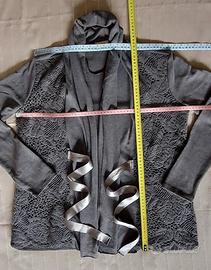 Il Collo scialle drappeggiato, le maniche e la parte posteriore sono a maglia unita, mentre i lati davanti presentano un meraviglioso e sofisticato inserto in pizzo traforato.