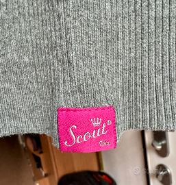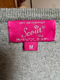 Cardigan Scout tg. M da donna o S da uomo, colore verdino salvia chiaro con toppe viola.
