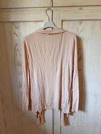 Il cardigan è caratterizzato da un taglio drappeggiato e aperto sul davanti