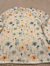 Cardigan con stampa floreale sui toni del giallo e verde chiaro sfumati, fondo bianco.