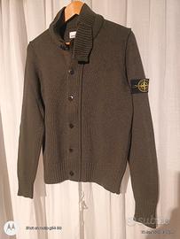 Cardigan in d'agnello Stone Island, colore verde militare con chiusura a bottoni e zip, collo alto foderato in feltro e badge di Stone Island sulla manica sinistra