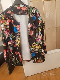 Cardigan / giacca leggera nera con stampa floreale colorata, molto vivace e femminile.