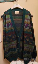 Cardigan vintage originale anni ’90 marca Darwin, Made in Italy, con splendida fantasia geometrica multicolore in stile azteco.