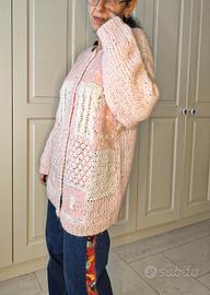 Cardigan vintage fatto a mano. Non presenta etichette. Morbido e caldo sicuramente in lana o misto lana. Molto bella la fantasia con vari tipi di maglia. Taglia stimata L, bello anche indossata oversize. Verifica le misure in foto. In foto indossato da taglia S alta m 1,63.