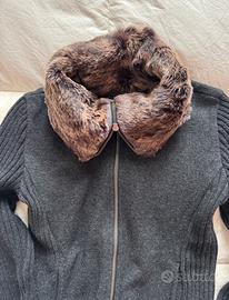 Cardigan di lana grigio scuro con cerniera aperta fino in fondo. Collo in pelo. Marca Woolrich. Ottime condizioni