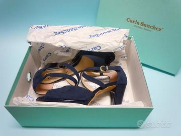 CARLA SANCHEZ Sandalo décolletè aperto - open toe - spuntate con cinturini incrociati alla caviglia - blu scamosciate vera pelle - Tacco basso 8 cm - con scatola originale.