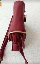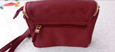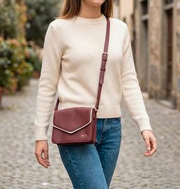 Borsetta a tracolla firmata Carpisa, color bordeaux/vinaccia. La borsa è nuova, mai usata, in condizioni perfette come da foto. Design elegante con finiture metalliche dorate e l'iconico logo della tartaruga sul fronte. Il materiale presenta una raffinata texture effetto "Saffiano", molto resistente e facile da pulire. Caratteristiche e Organizzazione: Chiusura: Patta frontale con clip magnetica + scomparto principale con cerniera. Tasche: Una pratica tasca esterna posteriore con zip per gli oggetti da tenere a portata di mano. Interno: Foderato in poliestere tono su tono, include un ulteriore taschino interno con zip. Tracolla: Regolabile per essere indossata a spalla o cross-body. (lunghezza cm 120 circa) Dimensioni (circa): Larghezza: 20 cm Altezza: 15 cm Profondità: 6 cm Materiali: Esterno: 70% PVC, 30% Poliestere Interno: 100% Poliestere 💫Aggiunta immagine digitale per simulare la vestibilità della borsetta indossata!