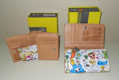 Vendo coppia di 2 Portafogli originali della "CARPISA", in confezione originale e mai usati. Il set si compone di un portafogli di dimensioni standard (15x9x4 cm) con multitasche per carte/documenti e 2 "tasche" per banconote oltre una tasca con cerniera per le monete; l'altro è un portafogli di piccole dimensioni (11x9x4 cm) con multitasche e con anche un piccolo borsellino per riporre la moneta. Il materiale è in tessuto esterno e pelle sintetica all'interno, le chiusure di entrambe i portafogli, sono con bottoni a pressione.