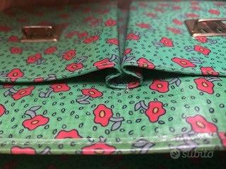 Iconica cartella Naj Oleari con Manico e spallacci. classico design floreale con fiori rossi su fondo verde. Primi anni '90. Con Manico e spallacci. Chiusure a scatto argentate.