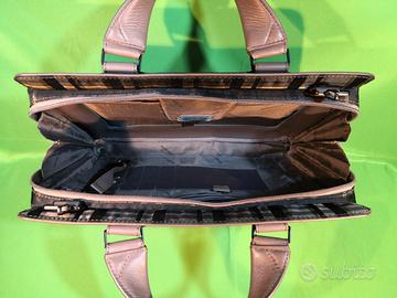 Piquadro cartella a tracolla unisex porta Ipad o computer fino a 14 pollici, con doppio manico. Realizzata in tessuto tecnico impermeabile a fantasia quadri nei toni tortora con inserti in vera pelle bovina. Tracolla regolabile in robusto tessuto. Dimensioni cm.37x29x10. Nel fronte due tasche esterne con cerniera, all’interno cinque tasche di cui tre con cerniera. Nel retro fascia con velcro per impilarla in un trolley da viaggio.