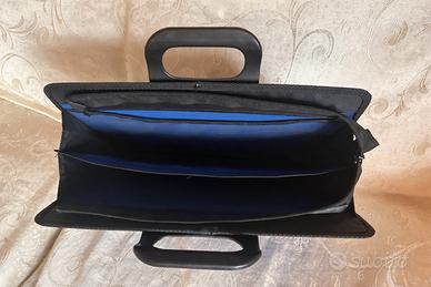 Si propone in vendita cartella porta documenti con manico rigido, colore blu con profili neri, completa di chiusura a zip e ampio scomparto interno.