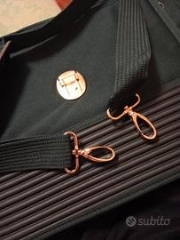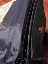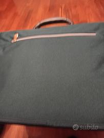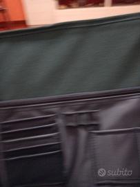 Cartella portadocumenti o porta computer. Verde, con tracolla, separatore interno, una tasca sul retro e una davanti, apribile mediante due cerniere laterali. All'interno vi si trovano degli scomparti porta tessere.