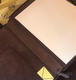 Pineider portadocumenti con blocco e cerniera su 3 lati in pelle marrone primo fiore nuova in scatola con custodia e busta con confezione regalo. Marchio PINEIDER stampato sulla cartellina e sul blocco notes formato A4.