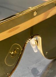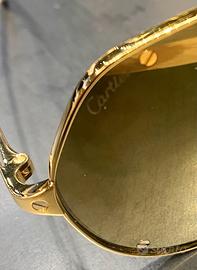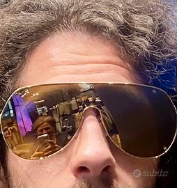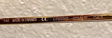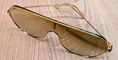 Occhiali originali, perfetti, forniti con custodia generica, non originale Misura XL Parte della collezione Santos, gli occhiali da sole CT0324S di Cartier sono fra i più audaci, senza dubbio. Il frontale oversize a maschera abbina la tinta dorata della montatura sottile in metallo al marrone della lente impreziosita dai rivetti simbolo della maison. Dettagli prodotto Designer: Cartier ID modello: CT0324S Colore: 003 - Gold Forma: A maschera Colore montatura: Oro Materiale montatura: Metallo Tipo montatura: Full Rim Colore lente: Bronze Materiale lente: Nylon Lenti polarizzate No Effetto specchio Sì Effetto gradiente No Taglia Ampiezza lente: 99 mm Larghezza ponte: 1 mm Lunghezza aste: 140 mm Consigliato per questi visi: Ovale A cuore A diamante Gli occhiali da sole Cartier Santos CT0324S, dell'iconica collezione Santos di CARTIER, sono stati appositamente progettati per gli uomini che desiderano combinare stile audace e comfort. Questo modello unico si distingue per la sua montatura a mascherina in metallo, che offre un'estetica all'avanguardia e la massima protezione. Ispirati al patrimonio del famoso orologio Santos, questi occhiali da sole sono la perfetta incarnazione dell'audacia e del lusso. L'occhiale è caratterizzato da una caratteristica forma a mascherina, ideale per chi desidera un look imponente e di grande impatto. La montatura è realizzata in metallo di alta qualità, che garantisce resistenza e leggerezza. Il design a cerchio assicura le lenti e aggiunge un tocco di lucentezza. L'imponente misura 99-1 assicura la massima copertura del viso, perfetta per gli uomini che cercano una presenza decisa e uno stile unico. La montatura a mascherina in metallo conferisce uno stile decisamente moderno, ideale per accompagnare outfit sia sportivi che eleganti. Gli occhiali da sole Cartier Santos non sono solo di grande impatto estetico, ma offrono anche una protezione solare di altissimo livello.