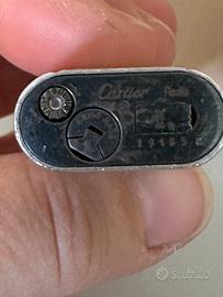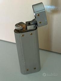 Accendino Cartier modello Santos. Presenta finitura spazzolata con viti decorative color oro a contrasto, funzionante. Numero di serie 19185T.