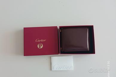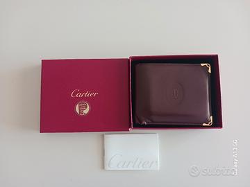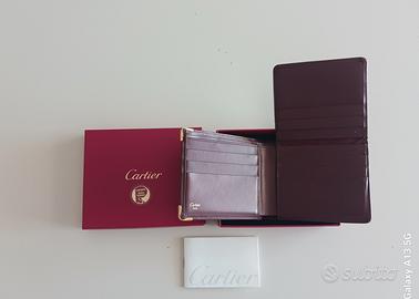 Portafoglio/portamonete/portacarte di credito in pelle di vitello bordeaux. Esterno: logo doppia C di Cartier in rilievo, angoli in metallo finitura oro. Interno: pelle di vitello bordeaux, firma “Cartier” color oro, tre tasche per carte di credito, una tasca piatta, una tasca portamonete, due tasche per banconote. Dimensioni 92 x 120 mm.