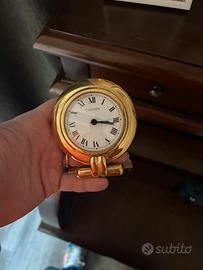 Raffinato orologio da tavolo Cartier, modello da viaggio in ottone dorato con quadrante classico a numeri romani e supporto pieghevole. Meccanismo al quarzo svizzero originale, con funzione di stand richiudibile – perfetto per scrivania, collezione o regalo di lusso.