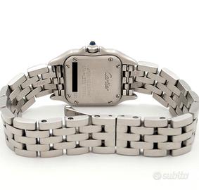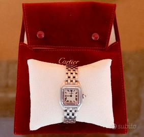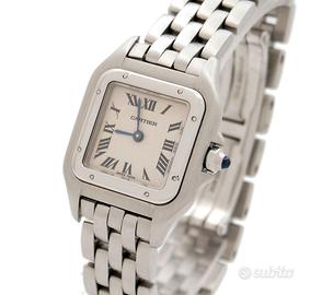 •OROLOGIO: Cartier Panthère PM Donna ref: W25033P5-1320 •MOVIMENTO: Quarzo, funzioni: ore, minuti. •QUADRANTE: Argentè. •CASSA: Acciaio, vetro in zaffiro, corona con zaffiro blu, dimensione 22mm. •BRACCIALE: Modello Panthère in acciaio. •CONDIZIONI: Orologio Usato in buone condizioni. •CORREDO: Sacchetto service Cartier. Si dichiara che l'orologio posto in vendita è completamente originale ed è esattamente quello visualizzato in queste immagini. Il prezzo è comprensivo delle eventuali spese di spedizione con corriere espresso assicurato. L’orologio viene venduto con regolare scontrino fiscale, completo di nostra dichiarazione di originalità e garanzia sul funzionamento per 12 mesi. IL PREZZO NON E’ TRATTABILE E NON SI ACCETTANO PERMUTE