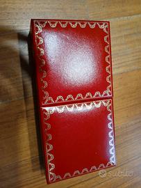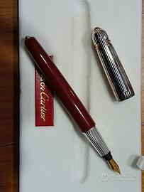 elegante stilografica di Cartier in finitura lacca rubino con cappuccio in argento e dettagli trinity ring in oro giallo,rosa e bianco.Pennino in oro 18 kt.Sistema a cartuccia.