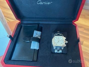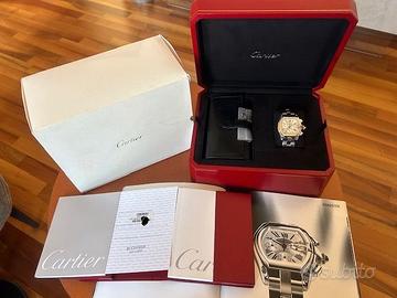 VENDO DALLA MIA COLLEZIONE PRIVATA, SPETTACOLARE ELEGANTE E SPORTIVO CARTIER ROADSTER CHRONOGRAPH XL 40MM AUTOMATIC, TUTTO IN ACCIAIO, REFERENZA 2618 E SERIALE 6920XXCE, MOVIMENTO MECCANICO A CARICA AUTOMATICA CON FAMOSO CALIBRO CON 37 RUBINI, QUADRANTE BIANCO, VETRO ZAFIRO, BRACCIALE IN ACCIAIO CARTIER, TUTTO RIGOROSAMENTE ORIGINALE E PERFETTAMENTE FUNZIONANTE (CONTROLLATO DI RECENTE DAL LABORATORIO), CONDIZIONI IMPECCABILI PARI AL NUOVO, DIMENSIONI DELLA CASSA OVER-SIZE 40X45MM CORONA DI CARICA E PULSANTI ESCLUSI, SUPER FULL SET COME ACQUISTATO: CONTROSCATOLA CON STICKER CHE SI TROVA SU GARANZIA, SCATOLA, LIBRETTI ED ACCESSORI PORTA CINTURINI, E CHIARAMENTE GARANZIA ORIGINALE CARTIER APRILE 2006 OROLOGIO VENDUTO DA BUCHERER LUZERN, SI RILASCIA ANCHE DICHIARAZIONE DI LECITA PROVENIENZA, OROLOGIO VERAMENTE RARO DA TROVARE COSI’ COMPLETO, BELLISSIMO ED IMPECCABILE COME RITIRATO DAL CONCESSIONARIO. VALUTO PERMUTE CON ROLEX. TRATTO SOLO CON PERSONE SERIE, QUINDI OFFERTE E RICHIESTE SENSATE. DICHIARO CHE L’OROLOGIO E’ ORIGINALE IN OGNI SUA PARTE.