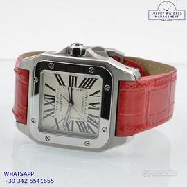 Per conoscere il prezzo e le caratteristiche tecniche dei nostri orologi visita il nostro sito ufficiale: https://lwmitalia.com/it Tutti i nostri orologi vengono verificati e revisionati dal nostro laboratorio specializzato “KeepTime Lab”: https://keeptimelab.com/it/ Cartier Santos 100 taglia XL grande acciaio, anno di produzione 2019, ghiera acciaio liscia a 8 viti, vetro zaffiro antiriflesso, quadrante colore bianco con indici romani e sfere al LumiNova, movimento meccanico a carica automatica, cinturino in pelle di alligatore colore rosso con doppia chiusura deployante acciaio originale Cartier. Orologio Cartier originale in ogni sua parte, nuovo di fabbrica e senza segni di usura, con ancora tutte le sue pellicole originali Cartier ancora applicate, full set (scatola, accessori vari, garanzia card ufficiale Cartier) garanzia/dichiarazione di vendita nostro negozio valida per 12 mesi