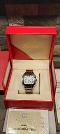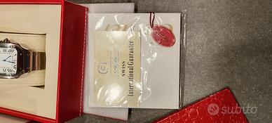 ⌚ Cartier Santos de Cartier – Eleganza Senza Tempo 🕰️ L'orologio in foto è un'icona dell'orologeria mondiale: il Cartier Santos de Cartier, celebre per essere stato uno dei primi orologi da polso moderni della storia, creato originariamente per l'aviatore Alberto Santos-Dumont. ✨ Dettagli Principali Quadrante Classico: Presenta il tipico design Cartier con numeri romani neri su fondo bianco opalino, minuteria a "chemin de fer" (a binario) e le inconfondibili lancette a forma di gladio in acciaio azzurrato. 🟦 Cassa e Ghiera: La cassa quadrata in acciaio inossidabile è sormontata dalla famosa lunetta con viti a vista, un tratto distintivo che conferisce un look industriale ma estremamente raffinato. 🔩 Cinturino Iconico: Bracciale in acciaio con il sistema di maglie decorate da viti, perfettamente integrato alla cassa per un comfort eccezionale al polso. 🔗 📦 Set e Corredo (Full Set) L'orologio è accompagnato dal suo corredo completo, che ne aumenta notevolmente il valore e l'autenticità: Packaging di Lusso: Box rosso Cartier con interni color crema e borsa coordinata con trama effetto coccodrillo. 🧧 Documentazione: Certificato di garanzia internazionale ("International Guarantee") e ricevuta d'acquisto originale. 📄 Accessori: Sigillo in cera rossa Cartier e libretti di istruzioni/manutenzione. 🏷️ 💎 Caratteristiche Tecniche Movimento: Carica automatica (visibile dalla dicitura "Automatic" sul quadrante). ⚙️ Materiale: Acciaio inossidabile di alta qualità. 🛡️ Stato: Dalle immagini, l'orologio sembra essere in ottime condizioni estetiche, pronto per essere indossato o collezionato. 🌟