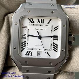 Per conoscere il prezzo e le caratteristiche tecniche dei nostri orologi visita il nostro sito ufficiale: https://lwmitalia.com/it Tutti i nostri orologi vengono verificati e revisionati dal nostro laboratorio specializzato “KeepTime Lab”: https://keeptimelab.com/it/ Cartier Santos De Cartier Large titanio, anno di produzione 2025, ghiera in titanio liscia a 8 viti acciaio, vetro curvo in zaffiro antiriflesso, quadrante colore bianco con data ad ore 06:00, indici romani e sfere colore blu, movimento meccanico a carica automatica, bracciale in titanio con viti in acciaio con doppia chiusura deployante originale Cartier, più altro cinturino in nabuk colore nero stampa alligatore con chiusura deployante titanio Cartier. Orologio Cartier originale in ogni sua parte, praticamente mai usato, in ottime condizioni come nuovo, segni di usura assenti o appena visibili, full set (scatola, accessori vari, garanzia card ufficiale Cartier valida per 2 anni), garanzia/dichiarazione di vendita nostro negozio valida per 12 mesi.