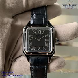 Cartier Santos Dumont extra-large acciaio e lacca nera, anno di produzione 2024, ghiera acciaio con lacca nera, vetro zaffiro antiriflesso, quadrante colore nero laccato con indici Romani e sfere gladio a forma di spada, movimento meccanico a carica manuale, cinturino in alligatore colore nero con chiusura a fibbia originale Cartier