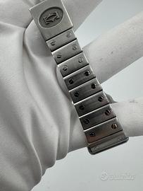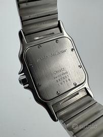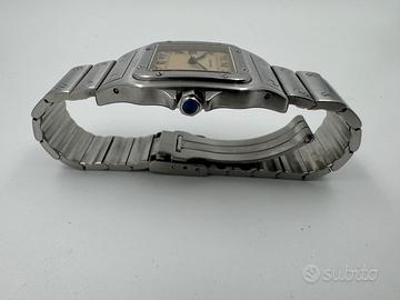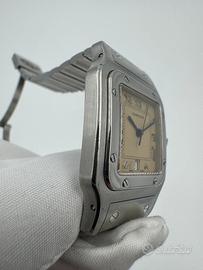 Cartier Santos Galbée 987901 acciaio – tropical dial raro Santos Galbée in acciaio, referenza 987901, classico Cartier con cassa e bracciale integrato e viti a vista. Quadrante molto interessante: ha sviluppato una patina tropicale uniforme color crema/caramello, cosa non comune su questo modello. Ogni pezzo è diverso, ma così omogeneo è difficile da trovare. Movimento al quarzo Cartier, datario a ore 6. Misura 29x41 mm, portabilissimo. Condizioni buone, segni coerenti con l’età. Orologio originale, senza modifiche strane. Pezzo per chi cerca qualcosa di diverso dal solito Santos “bianco pulito”.