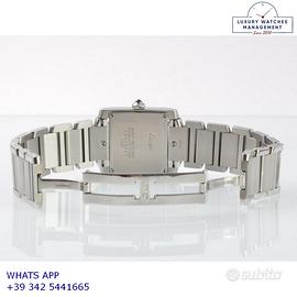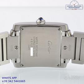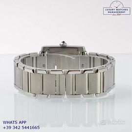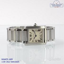 Cartier Tank Française 2465 Date Medium 25MM acciaio, anno di produzione 2010, vetro zaffiro antiriflesso, quadrante colore avorio con data, indici Romani e sfere colore blue originale Cartier, movimento al quarzo batteria, bracciale in acciaio con doppia chiusura deployante originale Cartier.