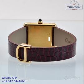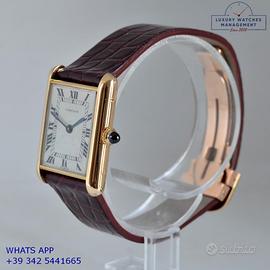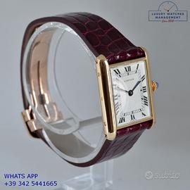 Cartier Tank Louis Cartier ultra piatto produzione prima serie di Parigi in oro giallo 18KT, anno di produzione 1971, vetro minerale dell’epoca, quadrante in smalto colore avorio con indici romani, movimento Cartier a carica manuale calibro base di Jaeger LeCoultre, cinturino in alligatore lucido colore bordeaux con chiusura deployante oro 18KT originale Cartier dell’epoca.