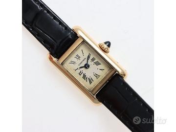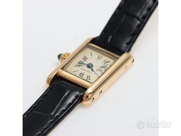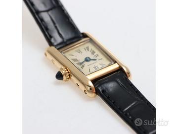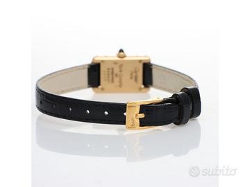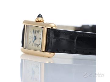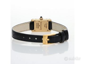 Clover Gioielli pone in vendita Cartier Tank Mini Ref. 828001 realizzato in oro giallo 18Kt, Quadrante bianco con numeri romani, Cassa 15 x 24. Cinturino in pelle nera con fibbia after. Movimento al quarzo. Orologio in buone condizioni. Anno 1990 (approssimativo).