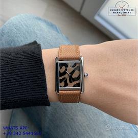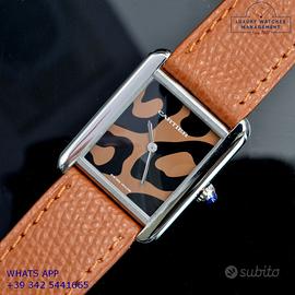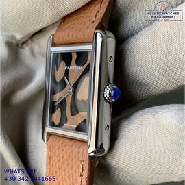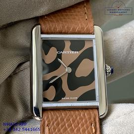 Cartier Tank 3170 Solo Panthère acciaio, anno di produzione 2016, vetro zaffiro antiriflesso, quadrante macchia leopardo originale Cartier, movimento al quarzo batteria, cinturino generico pelle di vitello colore nocciola con fibbia modello tipo Cartier.