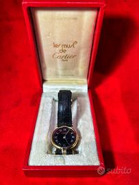 Orologio Cartier Vendome in argento placcatura spessa in oro 20micron Quadrante: Il quadrante nero con numeri romani e scritta argente’ e’ piu’ raro da trovare Cassa: La cassa in argento 925 da 24mm con placcatura in oro (Vermeil) presenta le punzonature corrette sul fondello, inclusa la dicitura 'ARGENT', il titolo '925' e il marchio 'PLAQUE OR G 20M'. Incisioni: Le incisioni sul fondello sono profonde e presentano il font tipico del periodo. La corona è ornata dal classico cabochon blu, correttamente proporzionato. Componenti: Il cinturino in pelle e la fibbia ad ardiglione originali Orologio tutto originale e coevo Revisionato perfettamente funzionante Preferisco la vendita di persona Posso valutare scambioo con orologio da uomo pari o valore superiore grazie!