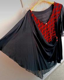 Salve vendo una meravigliosa casacca in chiffon e Pizzo con drappeggio laterale con delle pietre manica a pipistrello l'altra Molto coprente che si avvolge in vita , effetto snellante, taglia 53 calibrato nero e rosso veramente una casacca elegante e fine vendo a soli 55 euro