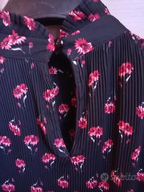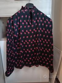 Casacca plissettata a fiorellini base nera, maniche lunghe, accollata con chiusura sul dietro con bottone. Tg S