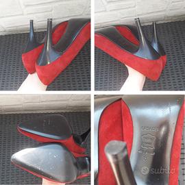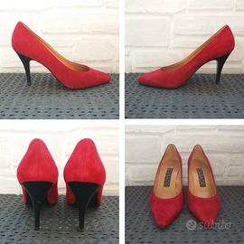 Decollete vintage marca Casadei, colore rosso scuro, punta a mandorla, tacco a spillo nero. Tomaia in pelle scamosciata, interno in pelle, suola in cuoio. Made in Italy.