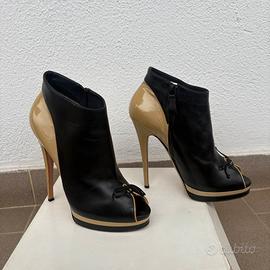 Stivaletti tronchetti stivaletto tronchetto Casadei colorblock spuntati spuntato punta aperta avanti in morbida pelle nappa nera e pelle vernice verniciata a contrasto beige chiaro con tacco a spillo a stiletto e leggero plateau Numero 10 che corrisponde ad un 40 italiano Usati ma in condizioni generali buone Segnalo Piccole macchie e segni sulla pelle verniciata ( vedi foto) Altezza tacco 15cm Altezza plateau 2cm