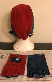Casco e guanti coordinati in pelle scamosciata di colore rosso e blu con logo NAZARENO GABRIELLI. Uso: auto spider e moto d’epoca. Il caschetto è foderato all'interno con fodera firmata NAZARENO GABRIELLI. I guanti hanno il logo NAZARENO GABRIELLI in metallo. Condizioni: nuovi, mai indossati.