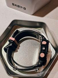 Orologio Casio G-SHOCK Analogico e Digitale modello BABY-G. Cassa in resina nera con pulsanti rosa(antiurto che protegge da urti e vibrazioni) , dimensioni (H x W x D) 45,2 mm x 42,6 mm x 13,3 mm- fondo in metallo .Vetro minerale.Quadrante nero con index rosa - lancette luminose - ora digitale - illuminazione led. Funzioni: Secondo fuso orario (L'orologio consente di impostare e visualizzare un secondo fuso orario. Ideale ad es. per chi effettua spesso telefonate intercontinentali) - Cronometro- 1/100 sec - 24 ore - Timer - 1/1 min. - 24 ore (Per chiunque ami la precisione: i timer conto alla rovescia aiutano a ricordare eventi particolari o che si ripetono, emettendo un segnale acustico al momento impostato. Il tempo può essere impostato in minuti e con un anticipo di fino a 24 ore. Particolarmente pratico per l'assunzione giornaliera di medicinali o l'interval training) - 5 allarmi giornalieri(sveglia) - Attivazione/disattivazione del suono dei tasti - Funzione di spostamento delle lancette (con la pressione di un tasto, le lancette si spostano permettendo la totale visibilità di funzioni quali cronometro o data) - Calendario automatico - classificazione di impermeabilità (10 bar); Formato 12/24 ore. Pedometro (contapassi per controllare il conteggio dei passi. Vetro minerale. Garanzia 2 anni.