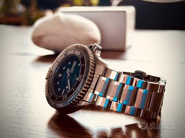 Cassa in perfetto stato di conservazione 43 mm, quadrante pulito e movimento al quarzo nuovo appena sostituito. Data e giorno, corona con avvitamento per una maggiore impermeabilità, davvero un orologio da collezionista. Tre cinturini nuovi, uno in pelle adatto ad ogni tua avventura da esploratore, uno in acciaio lucido per uno stile casual da tutti i giorni, con 2 maglie extra e la possibilità di scelta dell’attacco alle anse totalmente coprente o lineare, e in fine uno in gomma ancora da tagliare per essere adattato al proprio polso, ideale per il mare e per la bella stagione con attacco rapido alle anse. Per finire gli strumenti necessari per la sostituzione dei cinturini, tutto in una cassa dal gusto retrò in vero legno.
