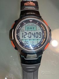 Vendo orologio da trekking Casio Pro Trek PRG-50-7VER ben conservato, usato pochissimo, unico difetto da segnalare è un piccolo graffio sul vetro. E' stata disabilitato la ricarica con pannello solare da un centro assistenza autorizzato Casio per avere tutte le funzionalità anche in caso di inutilizzo ed in assenza luce solare (va con normale pila 1616). E' comunque ripristinabile facilmente. Viene venduto con scatola e tutto il suo contenuto originale.