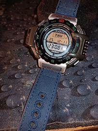 Casio Pro Trek,Triple sensor PRT 40, modulo-1470 "made in Japan". Precursore dei Protrek futuri fabbricato nei primi anni 90, il mio è del 1990,appena uscito l'ho comprato subito rimane un icona x collezzionisti e amatori...molto raro.. tutto perfetto e funzionante il ProTrek è cablato in resina ultra resistente con parti in acciaio come il fondello a 4 viti extra lunghe e i sensori temperatura e barometro. Appena cambiate le batterie ad alta carica (2) luce molto luminosa .guarnizione nuova..... purtroppo dato il tempo passato manca la confezionè, astenersi perditempo solo collezionisti e amatori dei modelli ProTrek,(altimetro, barometro con temperatura, bussola......dicesi Triple Sensor, il tutto messo a punto da un orologiaio professionista) preciso ai metri e ai gradi Barometro e bussola affidabili. x 4 anni le batterie non si cambiano anche con uso intenso.... cinturino in pelle ed uno in cordura blu nuovo pagato 30€ che ho montato, di riserva rimangono 2 cinturini uno lo regalo in cordura e credo fosse l'originale, e quello in pelle che si vede nella prima foto, tenendo conto che si ha 3 cinturini il prezzo è molto sottostimato rispetto alle valutazioni Casio Japan.
