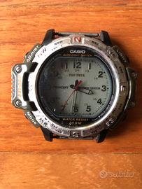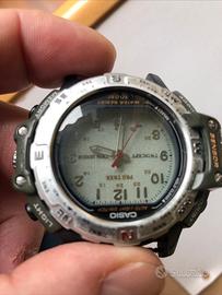 Casio Pro Trek PRT-50 Questo modello è celebre per la sua tecnologia Twincept, che sovrappone i dati digitali (come la bussola o l'altitudine) direttamente sul quadrante analogico grazie a un display LCD trasparente. Dettagli del tuo orologio: • Twin Sensor: È dotato di due sensori principali per misurare la direzione (Bussola) e l'altitudine/pressione barometrica. Il sensore è situato nella sporgenza sul lato sinistro della cassa. • Resistenza all'acqua: È garantito fino a 100 metri (10 bar), il che lo rende adatto per il nuoto ma non per le immersioni subacquee professionali. • Auto Light Switch: Una funzione avanzata per l'epoca che attiva la retroilluminazione automaticamente quando inclini il polso verso il viso. • Ghiera della Bussola: La ghiera argentata rotante serve per aiutarti nella navigazione manuale insieme ai dati digitali. ATTENZIONE OROLOGIO CON BATTERIA SCARICA E SENZA CINTURINO. PRIVO DI DIFETTI ESTETICI.