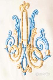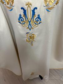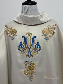 La casula è confezionata con un bel tessuto di colore avorio con lurex, ad effetto liscio. Si tratta di un tessuto facile da stirare, che mantiene bene la forma, senza stropicciarsi. Il mantello della casula è rifinito con uno sbieco perimetrale color oro. La casula ha la forma classica e dimensioni standard, con una lunghezza di 135 cm circa e un'ampiezza di 150 cm circa. È ornata su entrambi i lati con uno splendido ricamo a tema Mariano, che comprende il monogramma AM, realizzato con fili di seta dorata e policroma, con elementi in rilievo. La casula presenta un colletto a girocollo confezionato con lo stesso tessuto del mantello. È compresa di stola realizzata nello stesso tessuto del mantello.