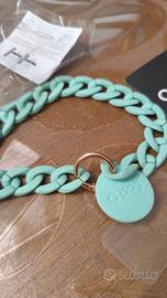 Catenella O bag in materiale plastico, colore teal, porta cellulare. - Design a maglie larghe. - Charm rotondo con logo O bag. - Anello dorato per aggancio.