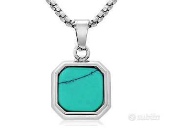 Collanina in acciaio inossidabile di colore argento con pietra quadrata color turchese. Lunghezza collana: 30cm. Il peso è di 5g circa.