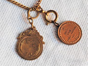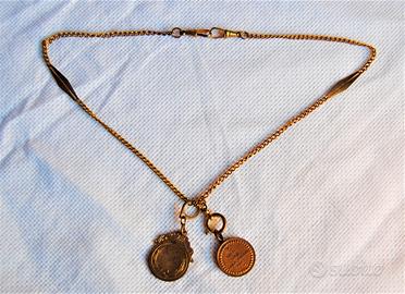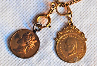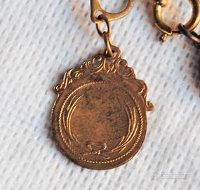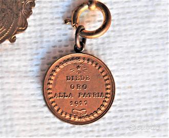 Rarissima ed affascinante, da reperire così completa, catenina di "alta bigiotteria" di propaganda del Fascismo nella seconda metà degli anni ‘30 cosiddetta “DIEDE ORO ALLA PATRIA” con ciondoli “a sterlina”. In particolare la catenina in argomento, realizzata in metallo dorato con i due ciondoli appesi in bronzo dorato, rappresenta una “FONTE MATERIALE” storica “molto importante” del Fascismo italiano riconducibile alla seconda metà degli anni ‘30 ovvero quando appunto gli italiani furono chiamati a raccolta dal Regime a dare oro alla patria, per fronteggiare le “sanzioni economiche” applicate all’Italia dalla “Società delle Nazioni” in risposta all’attacco all’Etiopia, che di lì a breve portò alla guerra d’Etiopia (18 novembre 1935 - 14 luglio 1936). Il primo ciondolo applicatovi rappresenta quando, nel 1917, fu dato per la prima volta oro alla patria per sostenere lo sforzo bellico (WW1) dove sul dritto è raffigurato un busto di donna, figura allegorica dell’Italia turrita e punzone Regia Zecca con contorno a cornice, mentre al verso nel campo entro ghirlanda di alloro legata da nastro in basso, sono presenti una stella raggiante e la dicitura “DIEDE = ORO = ALLA PATRIA = 1917”. Mentre il secondo ciondolo raffigura, al dritto il volto di Benito Mussolini di profilo e la dicitura “CREDERE OBBEDIRE COMBATTERE, al verso un campo cosiddetto “targa” dove era possibile incidere il proprio nome. Lo stesso si presenta in "ECCELLENTI" condizioni di conservazione, ancora in patina d'epoca, non ripulito, né lucidato, senza mancanze, rotture e/o difetto alcuno. Misure: lunghezza complessiva catenina = 440 mm; ciondolo Italia turrita = 21 mm (diametro); ciondolo mussoliniano = 26 mm x 21 mm.